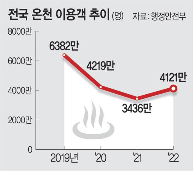 국내 온천 경기는 코로나19 이후 예전만큼 활성화하지 못하고 있다. 행정안전부에 따르면 국내 온천 이용객은 2019년 6382만 명에서 2021년 3436만 명으로 급감했으며 지난해 4121만 명으로 반전했지만 예년 수준에 이르진 못한 상태다. 온천 수는 2019년 총 458개에서 지난해 441개로 줄었다. 한국온천협회 관계자는 “국내 온천은 개발할 만큼 해 거의 포화 상태”라며 “전반적으로 코로나19 이전으로 돌아가고 있지만 시설이 낡고 접근성이 떨어지는 온천 위주로 이용객 감소로 문을 닫고 있는 상황”이라고 말했다.