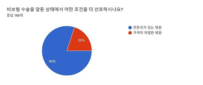 | ▲ 시민 160명을 대상으로 한 ‘병·의원 전문의 판별’에 관한 설문 결과다. 비보험 수술을 앞둔 상황에서 전문의 소재 의원을 선호한다는 응답이 80%에 달했다. |