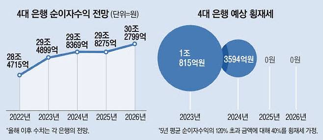 22일 매일경제가 4대 은행(KB국민·신한·하나·우리은행)으로부터 각 은행의 2018~2026년(2023년부터는 추정치) 예상 순이자수익을 취합해 분석한 결과 2025년부터는 횡재세 명목으로 세금을 거둬들일세금이 없는 것으로 나타났다. 당장 내년부터 민주당의 ‘횡재세 법안’이 시행돼도 세금 부과 효과가 2년 가량에 그치는 셈이다.