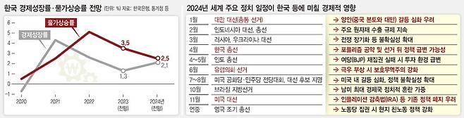 이시욱 대외경제정책연구원 원장은 이날 한겨레에 "내년은 그야말로 엄청난 선거의 해로, 선거를 내년 경제의 주요 키워드라고 하는 것도 전혀 이상하지 않다"며 "대만 선거 결과에 따라 중국과의 관계가 복잡해지고 미국도 대외 및 에너지 정책 방향 등이 상당히 달라질 가능성이 있다. 내년은 국내외 정치 상황이 경제에 미치는 영향이 가장 큰 해가 될 것"이라고 했다.