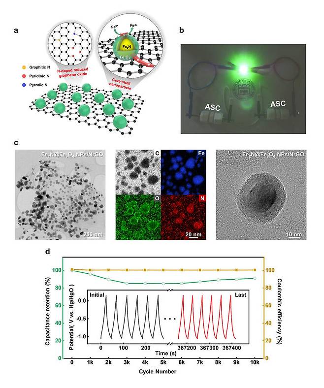이 교수팀은 전기 전도도가 우수하고 표면적이 매우 넓어 슈퍼커패시터 측면에서 이상적인 2차원 소재인 그래핀을 활용해 산화철과의 하이브리드 구조를 만들어 이 문제를 해결했다.