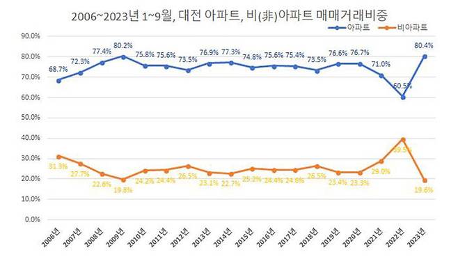 올해 대전 주택 매매 아파트 비중 80% 넘어…역대 최고치