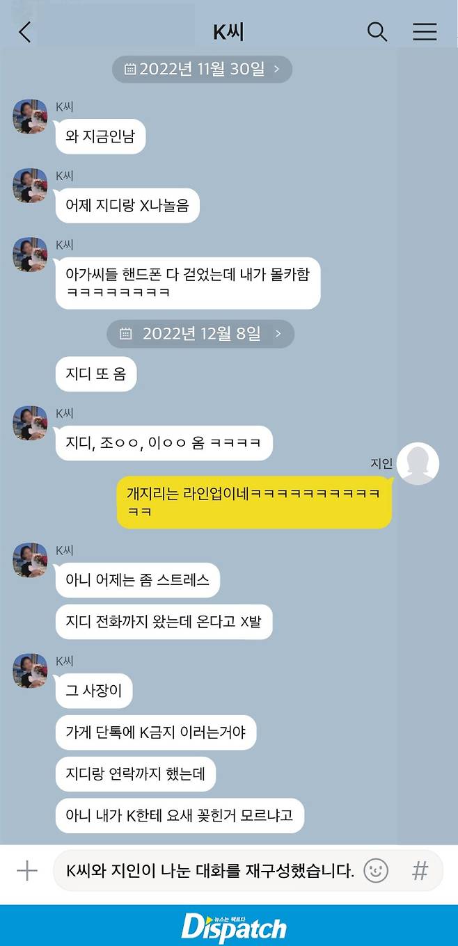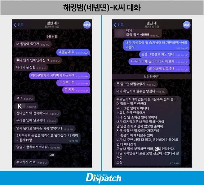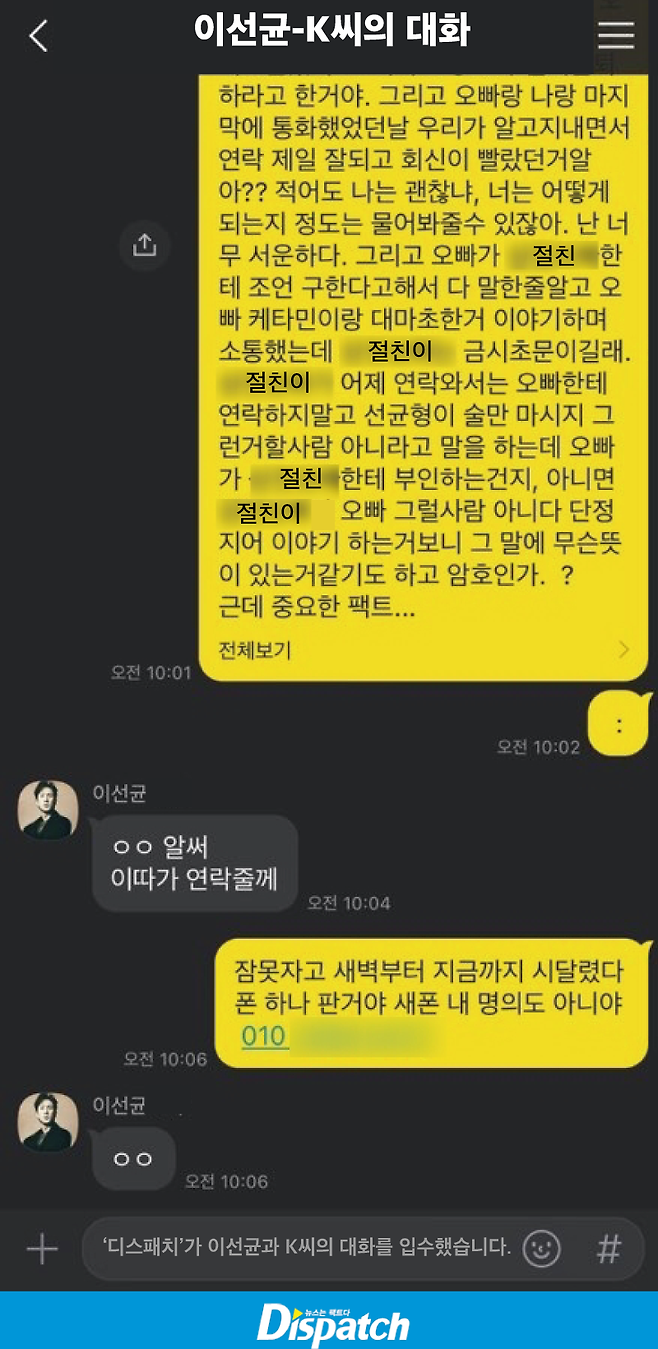 '디스패치'는 K씨와 해커(네넴띤)의 대화, K씨가 이선균에게 (일방적으로) 보낸 문자, K씨가 지인에게 보낸 카톡 등을 확보했다.