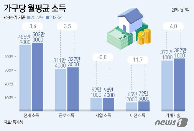 (서울=뉴스1) 김초희 디자이너 = 23일 통계청이 발표한 '2023년 3분기 가계동향조사 결과'에 따르면, 올해 3분기 가구당 월평균 소득은 503만3000원으로 지난해 같은 기간보다 3.4% 늘었다. 항목별로 근로소득은 322만3000원으로, 취업자 수가 늘고 임금이 오르면서 지난해보다 3.5% 증가했다. 이전소득(72만9000원)은 11.7%, 재산소득(3만5000원)도 16.5% 늘었다.