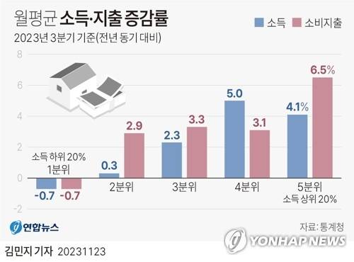 (서울=연합뉴스) 김민지 기자 = 통계청이 23일 발표한 '2023년 3분기 가계동향조사'에 따르면 3분기 소득 1분위 가구의 월평균 소득은 112만2천원으로 작년 동기 대비 0.7% 감소한 반면 소득 5분위 가구의 월평균 소득은 1천84만3천원으로 4.1% 증가한 것으로 나타났다.