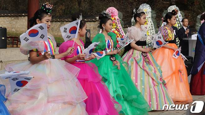 (서울=뉴스1) 박지혜 기자 = 23일 오후 서울 용산구 효창공원 의열사에서 임시정부 요원 환국 78주년을 맞아 열린 ‘제13회 효창원 8위 선열 의열사 숭모제전’에서 한복드레스를 입은 어린이들이 태극기를 흔들고 있다.