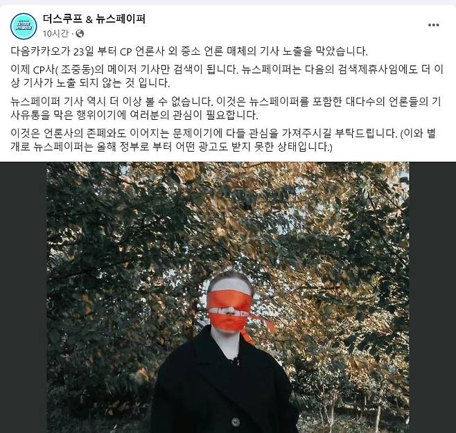 | ▲ 다음 검색 제휴사인 문학전문지 <뉴스페이퍼>는 23일 자사 페이스북에 사람의 눈과 입을 천으로 가린 사진과 함께 “다음카카오가 23일부터 CP 언론사 외 중소 언론 매체의 기사 노출을 막았다. 이제 CP사(조중동)의 메이저 기사만 검색된다”면서 “이것은 뉴스페이퍼를 포함한 대다수의 언론들의 기사 유통을 막은 행위이기에 여러분의 관심이 필요하다”고 밝혔다. |