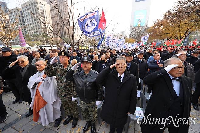 23일 오후 3시 서울 중구 세종대로 동화면세점 앞 인도에 녹갈색 군복을 입은 육군사관학교 출신 예비역, 빨간 모자를 쓴 해병대 출신 예비역 등 500여 명(주최 측 추산)이 빽빽하게 모여 앉았다.