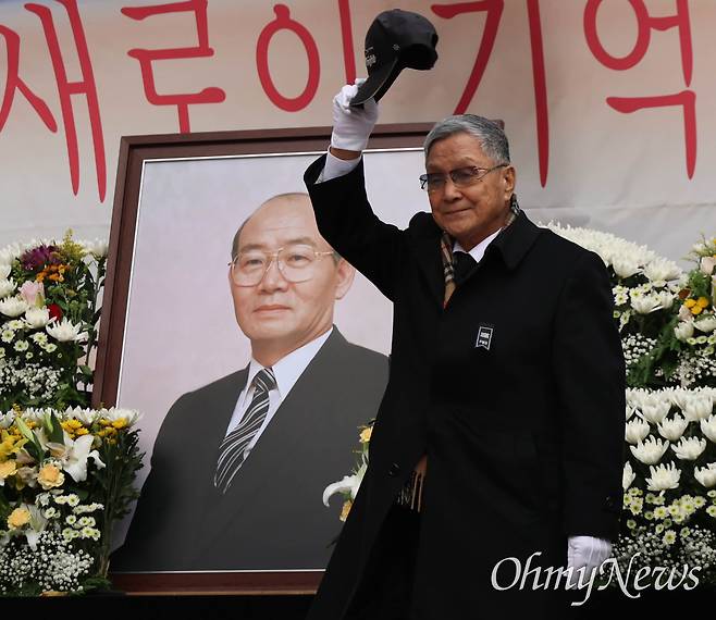 | ▲ 전두환 2주기 추모식이 23일 오후 서울 광화문네거리 동화면세점앞에서 육사총구국동지회, 전국구국동지연합회 주최로 열렸다. 12.12군사반란 핵심이었던 박희도 전 육군참모총장이 참석자들에게 손을 들어 인사하고 있다. |