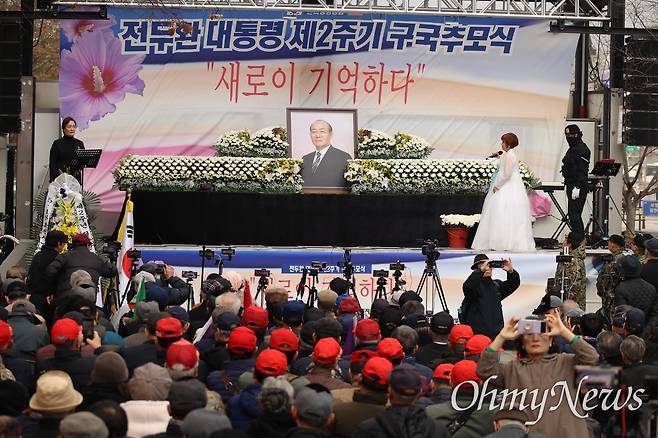 | ▲ 전두환 2주기 추모식이 23일 오후 서울 광화문네거리 동화면세점앞에서 육사총구국동지회, 전국구국동지연합회 주최로 열렸다. |