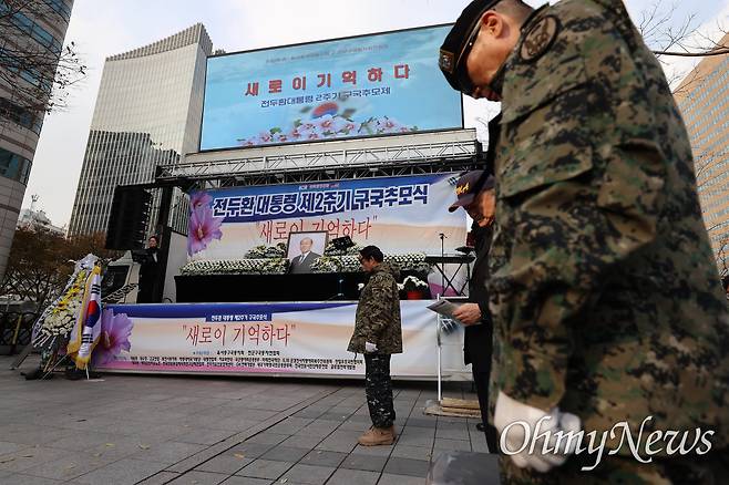 이날 '전두환 전 대통령 서거 2주기 구국추모제'에 참석한 육·해·공군 및 해병대 예비역 장교들은 '새로이 기억하다'라는 문구와 함께 무대 한가운데 마련된 전두환 영정을 향해 묵념을 올렸다. 대부분 전두환 군사정권 당시 복무한 군인들이었다.