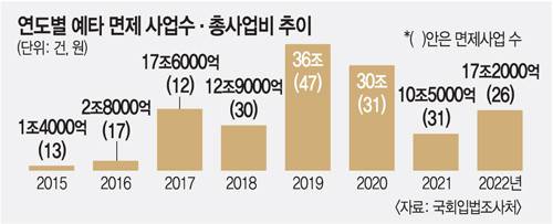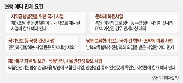 현 정부는 지난해 말 예타 제도 개편 방안을 발표했다. 현재 예타 면제 대상인 문화재 복원 사업은 복원 외 도로 정비 등 주변정비사업 비중이 50%를 넘는 경우 예타 면제에서 제외하는 등의 내용이 담겼다. 다만 정부의 예타 강화 방침이 효과를 거둘지는 미지수다. 정치권이 특별법 제정을 통해 일부 사업에 대한 예타 자체를 피하고 있어서다. 과거에도 총선을 앞둔 시점에 예타 면제가 급증하는 경향이 강했다. 2020년 21대 총선을 앞둔 2019년 예타를 면제받은 사업 규모는 36조원이었다. 2018년의 12조9000억원에 비해 3배가량 늘어난 것이다.