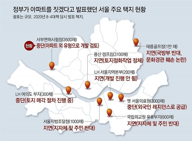 23일 국토교통부에 따르면 8·4 공급대책 당시 정부는 도심 공급이 부족하다는 지적에 따라 서울을 중심으로 수도권 신규 공공택지에 3만3000채를 짓겠다고 발표했지만, 상당수가 좌초되고 있다. 공릉동 태릉골프장(1만 채)을 비롯해 △경기 과천시 중앙동 정부과천청사 일대(4000채) △서울 마포구 상암동 서부면허시험장(3500채) △서울 용산구 한강로1가 캠프킴 부지(3100채) △서울 마포구 상암동 디지털미디어시티(DMC) 미매각부지(2000채) 등이다.
