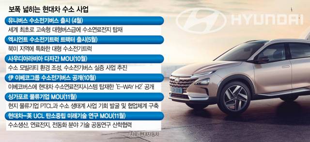 현대차그룹은 지난 21일엔 싱가포르 물류기업 PTCL과 ‘수소 모빌리티 생태계 구축 협약'을 맺었다. 양사는 싱가포르에서 수소 생태계 사업 기회를 발굴하고 협업체계를 구축할 계획이다. 현대차는 지난 10월엔 사우디아라비아에서 수소 모빌리티 환경 조성, 수소전기버스 실증 사업 추진 등을 골자로 한 MOU를 체결하기도 했다.