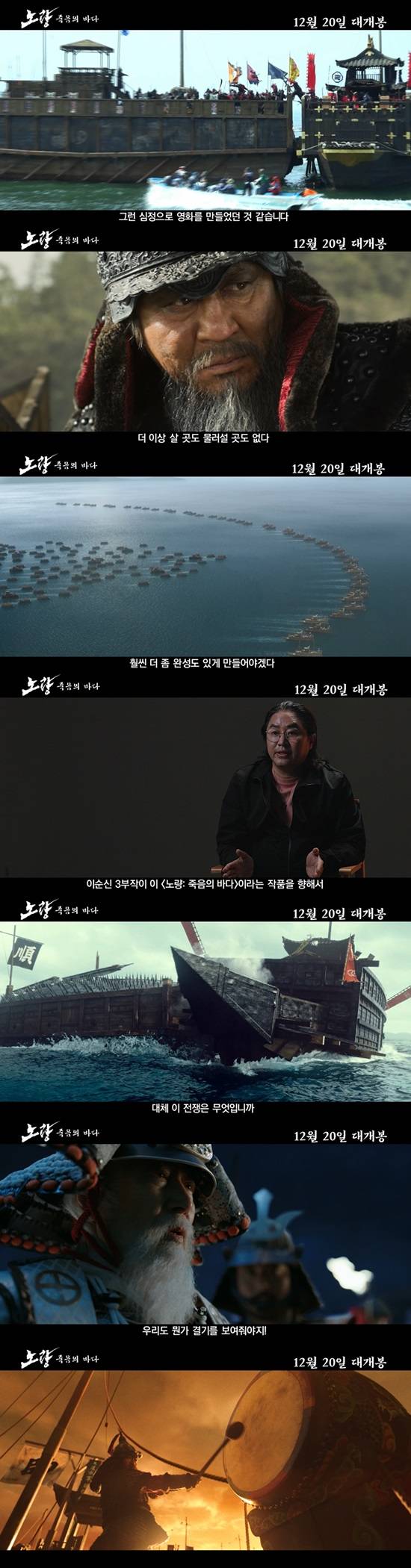 그리고 여정의 마지막 작품이자 대미를 장식할 '노량: 죽음의 바다'까지 이순신 3부작 프로젝트의 압도적인 프로덕션을 총망라하는 모습이 담겨 있어 보는 것만으로도 큰 울림을 자아낸다.