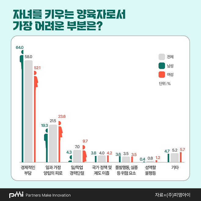 우선 자녀를 키우는 양육자로서 가장 어려운 부분에 대해 절반 이상, 많게는 10명 중 6명 가까이 ‘경제적인 부담(58.0%)’이라고 답했습니다. 남성(64.0%)이 여성(52.1%)보다 다소 높은 수준으로 부담을 느꼈습니다.