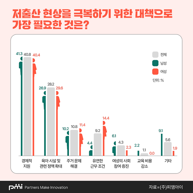 저출산 현상을 극복하기 위한 대책을 물었더니, 이 역시 가장 부담을 주는 요소를 상쇄하는데서 답을 찾았습니다. ‘경제적 지원(40.8%)’이 가장 응답률이 높게 나타났습니다.