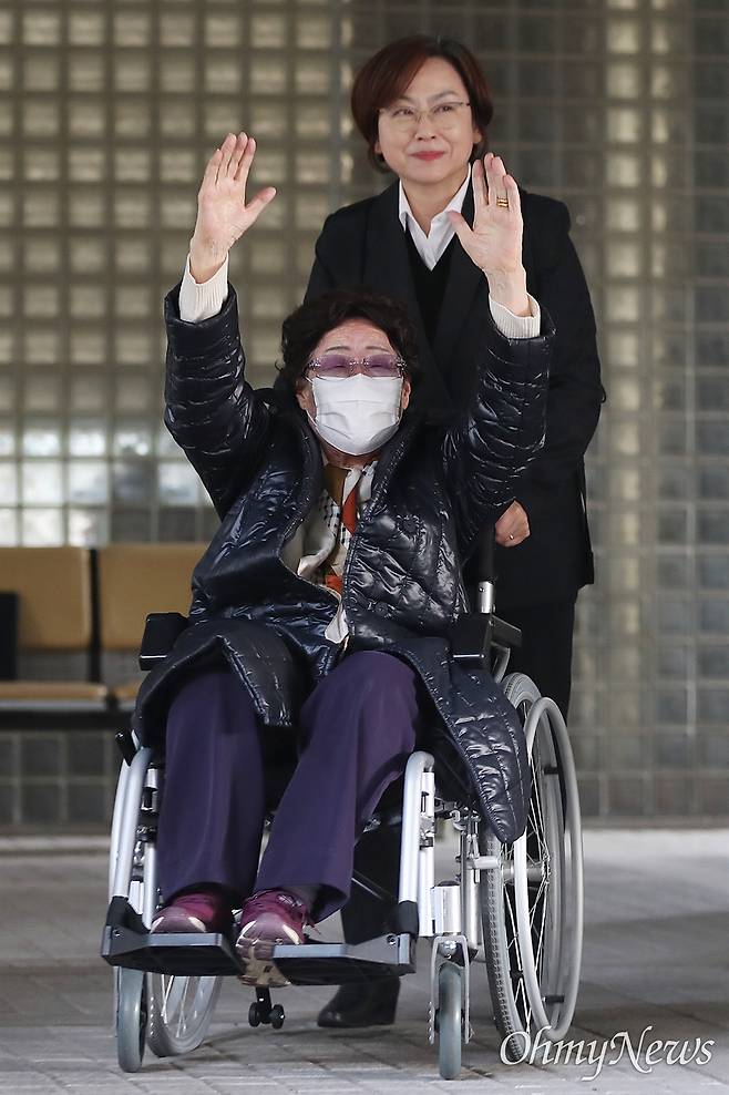 | ▲ 23일 오후 서울고법 민사합의33부가 일본군 위안부 피해자들이 일본 정부를 상대로 제기한 손해배상청구소송 항소심에서 원고 청구를 인용하고 위자료 지급을 명령했다. 재판이 끝난 후 위안부 피해자 중 한 명인 이용수 할머니가 기뻐하며 만세를 부르고 있다. |