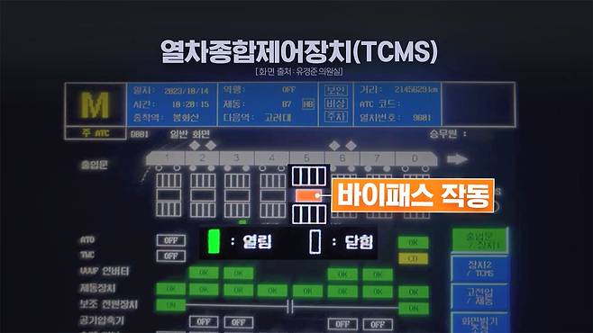 사고 당시 열차종합제어장치(TCMS) 화면을 보면 '바이패스 작동 중' 즉 출입문 고장 경보를 무시한다는 의미의 '빨간색 등'이 켜진 반면, 출입문 열림을 알리는 '초록색 등'은 꺼져있습니다.