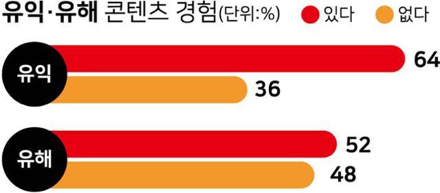 이러한 숏폼 콘텐츠의 양면성을 확인하기 위해 숏폼 콘텐츠 시청자들을 대상으로 유익하거나 유해한 콘텐츠 접촉 경험을 물었다. 숏폼 시청자 10명 중 6명 이상(64%)은 숏폼 콘텐츠를 시청하면서 지식 습득 또는 금전적 이익 등의 내용을 담은 유익한 콘텐츠를 시청한 경험이 있다고 응답했다. 2명 중 1명(52%)은 숏폼 콘텐츠를 시청하면서 성적이거나 잔인한 내용의 유해한 콘텐츠 또한 시청한 경험이 있다고 응답했다. 연령대가 낮을수록 유익한 콘텐츠와 유해한 콘텐츠 시청 경험 모두 높았다.