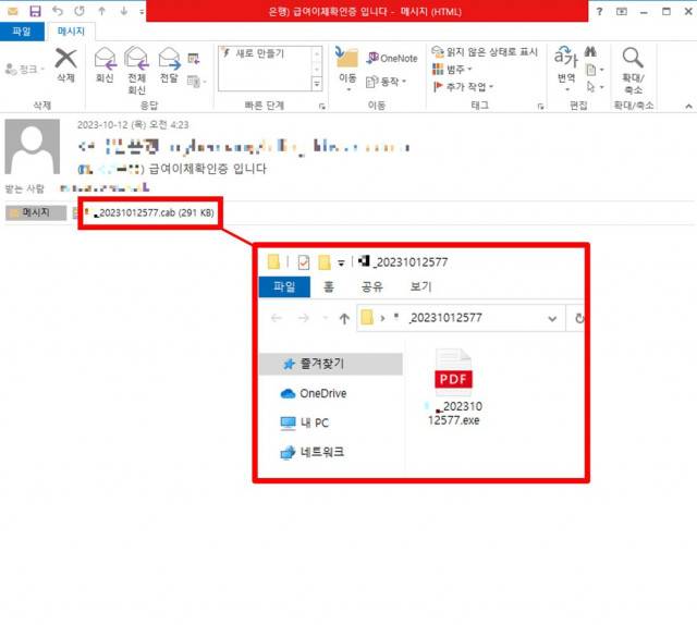 급여 이체 확인증을 위장해 유포 중인 악성 실행형 파일도 발견됐다. 공격자는 ‘(OO은행) 급여 이체 확인증 입니다’라는 제목의 메일에 압축파일을 첨부해 전송했다. 첨부파일의 압축을 해제하면 PDF 파일 아이콘으로 위장한 실행 파일(.exe)이 나타난다.