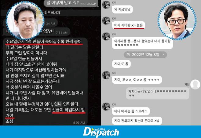(디스패치는 K씨 카톡에서 일부 허위 또는 조작 문자를 발견했다. 특히 이선균을 언급하는 부분에서 신빙성이 깨지는 대화도 있었다. 문자 및 진술에 의존한 수사는 더욱 신중할 필요가 있다.)