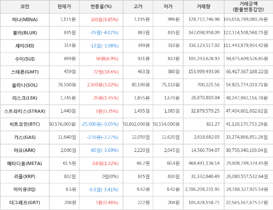 또한, 미나(9.85%, 1,115원), 수이(6.9%, 899원), 솔라나(3.02%, 78,500원), 리스크(1.45%, 1,745원), 메타디움(1.32%, 61.5원), 더그래프(0.48%, 208원), 스트라티스(0.35%, 1,440원)가 상승세를 나타냈다.