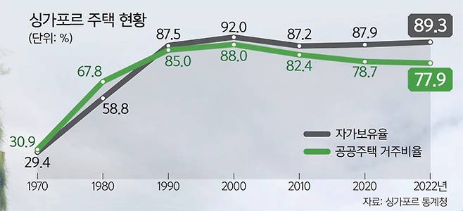 싱가포르국립대 도시계획과 이관옥 교수는 “한국은 집을 구매하려면 목돈이 필요해서 젊은 층이 전셋집에 들어가 돈을 모으지만, 싱가포르에서는 목돈이 필요하지 않다”며 “청년이나 신혼부부도 자기 일단 5%의 최초 구입비만 지불하면 내 집을 마련할 기회가 생긴다”고 설명했다. 그는 “자가를 보유한 이들은 주택 가격이 상승함에 따라 자연스럽게 자산도 늘어난다”며 “집이 청년들의 ‘도약의 발판’이 되는 것”이라고 덧붙였다.