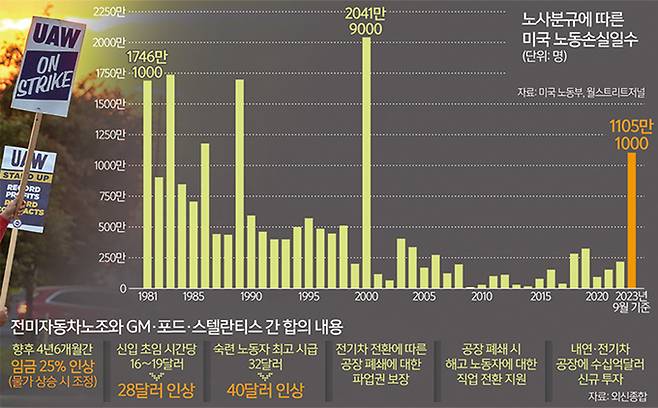 전미자동차노조(UAW)가 9월15일(현지시간)부터 미국 역사상 최초로 완성차 업체 ‘빅3’를 상대로 46일간 벌인 동시 파업은 노조 승리로 끝났다. 숀 페인 UAW 위원장은 지난달 말 노사 잠정 합의안 타결 직후 “1930년대 이후 가장 놀라운 승리 중 하나”라고 선언했다. 향후 4년6개월간 급여 25% 인상이 뼈대를 이루는 잠정안은 최근까지 이어진 조합원 동의 투표에서 가결돼 곧바로 임금이 11% 오르게 된다.