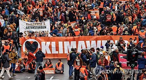 epaselect epa10994050 People carry a large banner as they block a street during a protest by the Last Generation climate activists in Berlin, Germany, 25 November 2023. EPA/HANNIBAL HANSCHKE