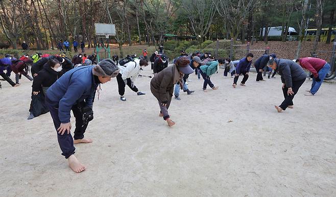 서울 강남구 대모산 입구에 등산복 차림의 사람들이 모이기 시작한다. 매서운 추위에도 각자 신발을 벗어 가방에 집어넣는다. 요즘 열풍을 일으키고 있는 ‘맨발걷기 숲길 힐링스쿨’ 참석자들이다.