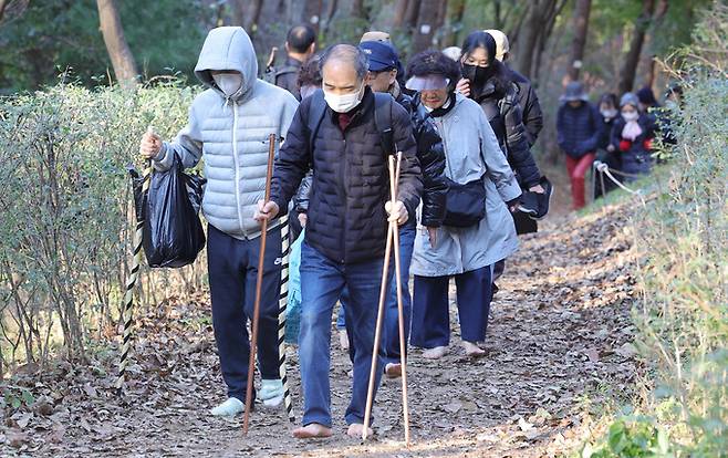 맨발 걷기 숲길 힐링스쿨에 참석한 참가자들이 맨발로 강남구 대모산을 오르고 있다.