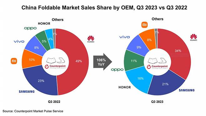 24일 시장조사업체 카운터포인트리서치에 따르면 올해 3분기 중국 폴더블폰 점유율에 큰 변화가 일었다. 1위 화웨이의 위상이 깨지고, 2위 삼성전자를 제외한 주요 브랜드의 순위가 역전됐다.
