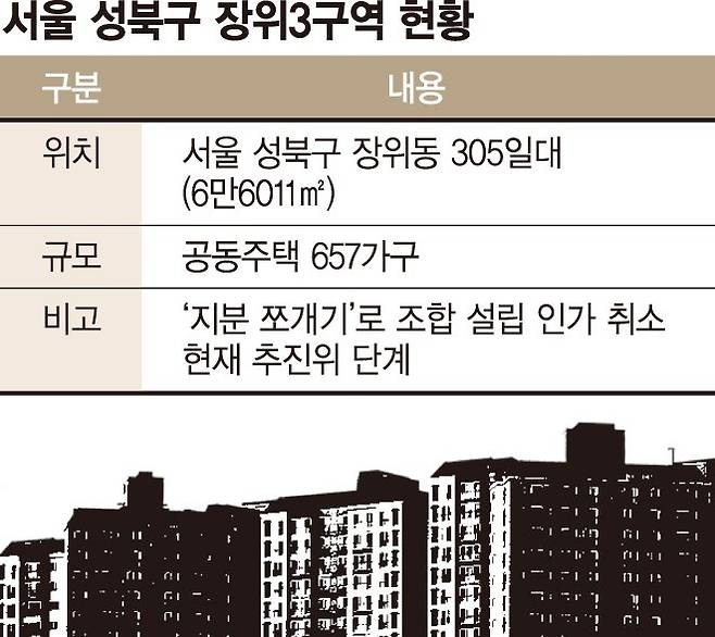 26일 정비업계에 따르면 지난 9월 '지분 쪼개기'로 인해 정비 사업 최초로 법원으로 부터 조합 설립 인가가 취소된 서울 성북구 장위3구역 재개발 사업이 중대기로에 놓였다.