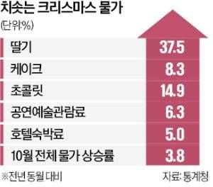 놀거리도 마찬가지다. 10월 기준 노래방 이용료가 1년 전보다 6.9%, 공연예술 관람료가 6.3%, 호텔 숙박료는 5.0% 올랐다. 미용료(5.6%), 뷰티이용료(5.9%) 등 데이트 준비 비용도 크게 늘었다. 크리스마스 물가 품목은 대체로 연말로 갈수록 수요가 몰리며 물가가 뛴다. 지난해 12월 딸기 가격이 전월 대비 93.7% 폭등한 것이 한 예다.