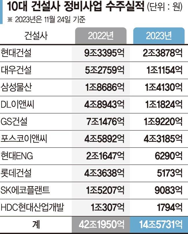 건설협회 관계자는 "10대 건설사의 정비사업 수주건수는 포스코이앤씨를 제외하곤 모두 10건 이하"라며 "중견건설사들도 올해 내내 1~2건 수주한 업체가 태반"이라고 말했다.