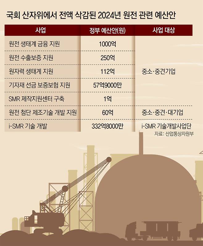 26일 업계에 따르면 최근 산자위에서 삭감된 원전 예산 1814억 원의 대부분은 중소·중견기업이 지원 대상이었던 것으로 나타났다. 삭감된 예산의 세부 항목을 살펴보면 ‘원전 생태계 금융 지원’(1000억 원), ‘원전 수출보증 지원’(250억 원), ‘원자력 생태계 지원’(112억 원), ‘원전 기자재 선금 보증보험 지원’(57억9000만 원), ‘소형모듈원전(SMR) 제작지원센터 구축’(1억 원) 등이다. 오로지 중소·중견기업만을 대상으로 하는 지원 예산이 총 1420억9000만 원(78.3%)에 달하는 것이다. 여기에 중소기업부터 대기업까지 모든 기업을 대상으로 하는 ‘원전 첨단 제조기술 개발 지원’(60억 원) 예산까지 합치면 중소·중견기업 관련 예산은 1480억9000만 원(81.7%)이었다.