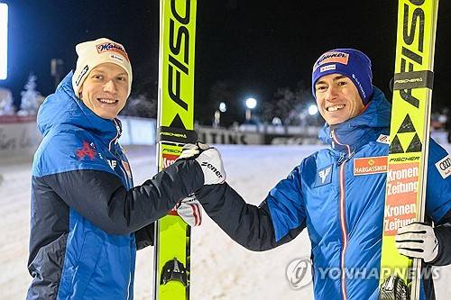 epa10996693 Second placed Jan Hoerl of Austria (L) and winner Stefan Kraft of Austria (R) celebrate after the Men Large Hill Individual competition at the FIS Ski Jumping World Cup in Ruka, Finland, 26 November 2023. EPA/KIMMO BRANDT