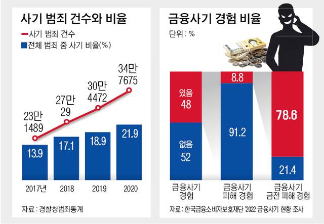금융분야를 포함한 사기 범죄는 해마다 늘어나는 추세다. 경찰청범죄통계를 보면 2017년 23만1489건이었던 범죄 건수는 2020년 34만7675건으로 급증했다. 전체 범죄 가운데 사기가 차지하는 비율 역시 같은 기간 13.9%에서 21.9%로 가파르게 올랐다.