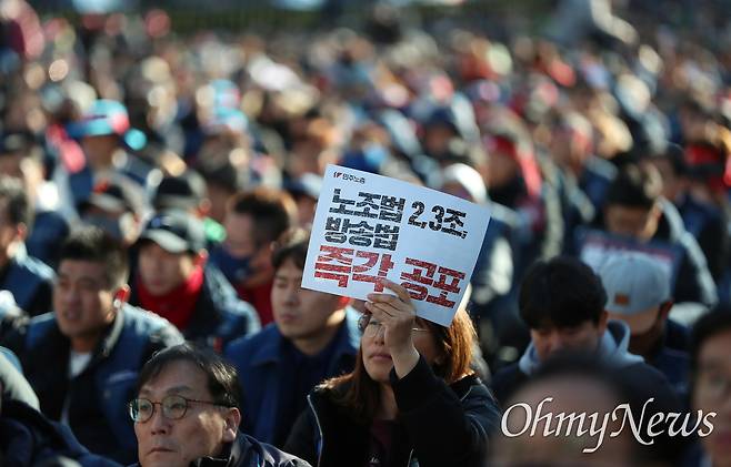 | ▲ "노조법 2.3조, 방송법" 즉각 공포! 민주노총 조합원들이 지난 20일 오후 서울 광화문 동화면세점 앞에서 "노조법 2.3조, 방송법 쟁취를 위한 민주노총 총파업·총력투쟁대회"를 하고 있다. 투쟁대회 참석자들은 "대통령의 거부권 거부! 원청 사용자성 인정! 쟁의대상확대! 손배가압류 금지! 언론탄압 저지! 이동관 탄핵! 노조법 2.3조, 방송법 쟁취! 등을 촉구했다. |