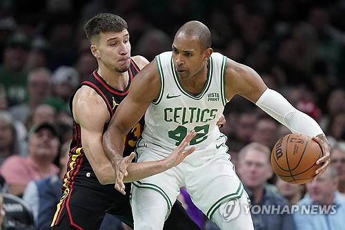 Boston Celtics center Al Horford (42) drives toward the basket as Atlanta Hawks guard Bogdan Bogdanovic, left, defends in the second half of an NBA basketball game, Sunday, Nov. 26, 2023, in Boston. (AP Photo/Steven Senne)