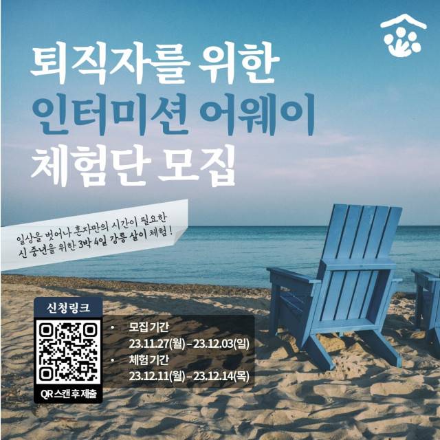 체험단 모집은 11월 27일부터 12월 3일까지 진행된다. 강릉 한 달 살기를 미리 경험하고 싶은 50세 이상 퇴직자는 링크를 통해 신청이 가능하다. 앞으로 배우자 및 자녀들이 참여할 수 있는 맛보기 프로그램도 운영할 예정이며, 관련한 소식은 인스타그램으로 안내할 예정이다.