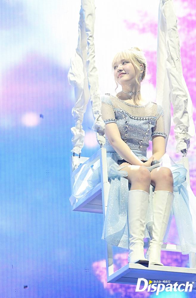 멤버들은 그네에 올랐습니다. 팬송 '샤인 위드 미'를 불렀는데요. 높은 곳에서도 흔들림 없는 가창력을 자랑했죠. 이때 리즈의 시선이 한쪽을 향했습니다.