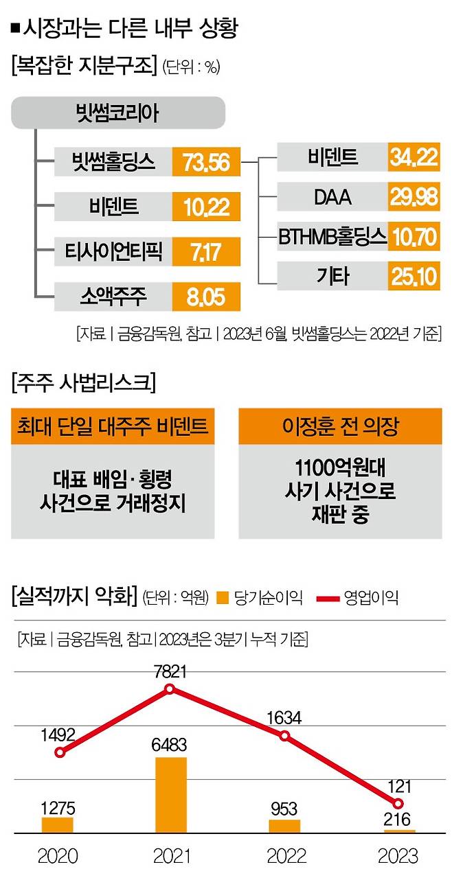최대주주 비덴트(34.22%)를 뺀 나머지 65.68%를 싱가포르 법인 DAA 29.98%, BTHMB홀딩스 10.7%, 기타 25.10% 등이 보유하고 있다. 이렇게 복잡한 지분율은 최대주주 리스크를 푸는 데 나쁜 변수로 작용할 가능성이 있다. 빗썸 측은 "주주사들과의 협의를 통한 지분율 변경에 나서고 있다"면서 빗썸홀딩스의 대주주 비덴트를 둘러싼 위험요인을 해소할 수 있다는 입장이지만, 시장의 전망은 밝지 않다.