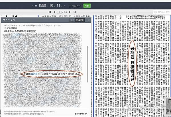 | ▲ <조선일보>가 1990년 10월 11일자 보도에서 공개한 '부동산 상습투기자 명단'에는 '최은순(44, 가내의류가공업, 여, 성북구 장위동 75, 37)'라고 적혀 있었다. |