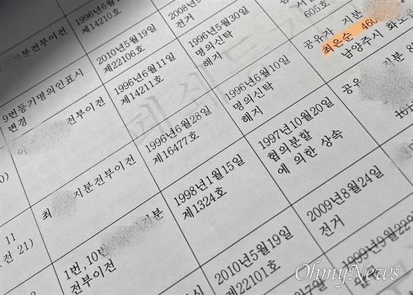 1987년 2월 차명매입한 석문면 교로리 942-OO의 경우 최씨 지분은 2010년 6월에 이르러서야 다른 이에게 이전된 것으로 확인됐다. 1986년 3월 매입한 송산면 당산리 땅 일부와 1988년 1월 매입한 송악읍 영천리 임야는 현재도 최씨가 갖고 있다.