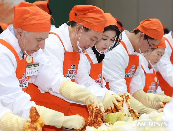 [고양=뉴시스] 조수정 기자 = 윤석열 대통령과 부인 김건희 여사가 27일 경기 고양시 킨텍스에서 열린 나눔과 봉사의 국민 대통합 김장 행사에서 김치를 담그고 있다. 2023.11.27 chocrystal@newsis.com