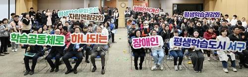 광주광역시 서구(구청장 김이강)는 지난 25일 서구청에서 '학습공동체로 하나되는 우리'라는 주제로 17개 장애인평생교육기관 교육생 300여 명이 참석한 가운데 '장애인 평생학습 한마음 축제'를 개최했다.