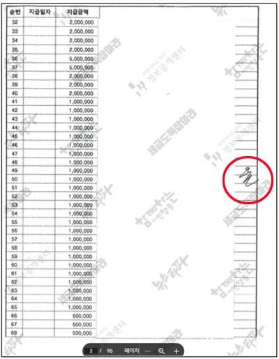 | ▲ 2018년 2월 12일자 서울중앙지검 특수활동비 지출내역기록부, 윤석열 당시 중앙지검장이 “윤”이라고 서명한 것이 오른쪽에 보인다. |