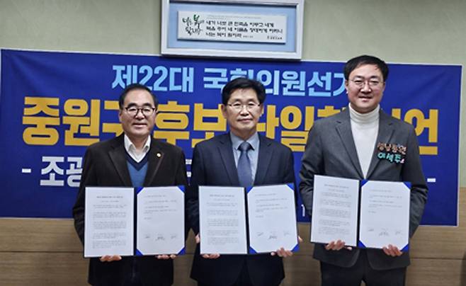 "제22대 국회의원선거 성남시 중원구 출마예정자인 조광주, 윤창근, 이석주는 중원구의 신도시 건설과 발전을 위해 후보단일화를 하기로 합의하고 선언한다."